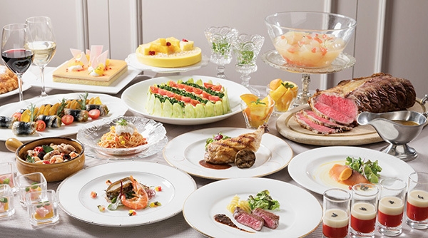 ディナーでは、昨年人気の「クレーム・ド・ペーシュ(桃のクリームスープ)」に、フォアグラのソテーを添えて再登場。さらに、「鮑と海老のグリエ」から、その場で切り出す「スモークサーモン」のオードブル、お好みのソースや岩塩などの調味料(8種)を楽しめる人気の「ローストビーフ」をご用意します。