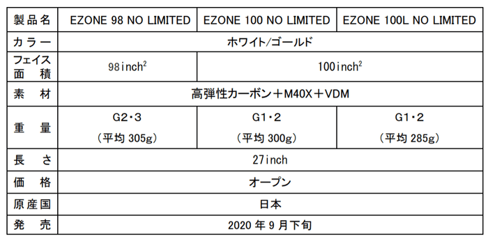 ラインナップは「EZONE 98 NO LIMITED」(98平方インチ・平均305g)、「EZONE 100 NO LIMITED」(100平方インチ・平均300g)、「EZONE 100L NO LIMITED」(100平方インチ・平均285g)の3種類。