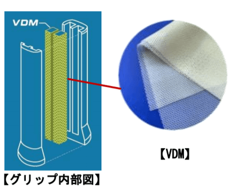 特殊なメッシュ状の新振動吸収素材「VDM」をグリップ部に内蔵。従来素材よりも広範囲にわたって使用することで、打ち負けない衝撃吸収性を実現しました。