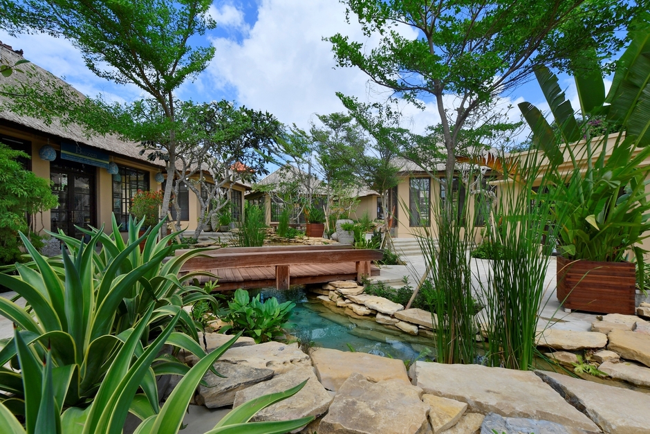 ショッピングエリアの外観は茅葺屋根などの伝統的なバリ式建築様式を取り入れ、ガラス越にウィンドウショッピングが楽しめるようになっていることに加え、周囲は美しい花々に囲まれ、池や木製の橋などが目にも楽しく心を和ませてくれる雰囲気なのも魅力です。