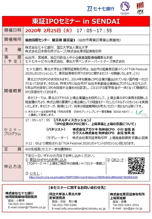 七十七銀行、東北大学および東京証券取引所は、仙台市の起業家応援イベント「TGA Festival 2020」の1セッションとして、東京証券取引所でのIPOに関するセミナーを開催する。(※)