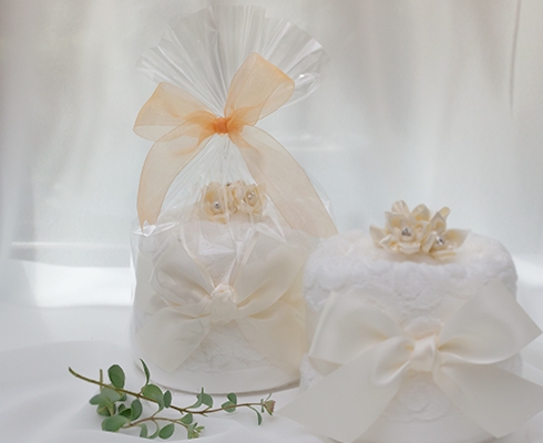 品のあるまっ白な今治タオルを組み合わせたウェディングケーキ風のオリジナル「タオルケーキ」はウェディングだけではなく、あらゆるシーンで目を引く贈り物です。