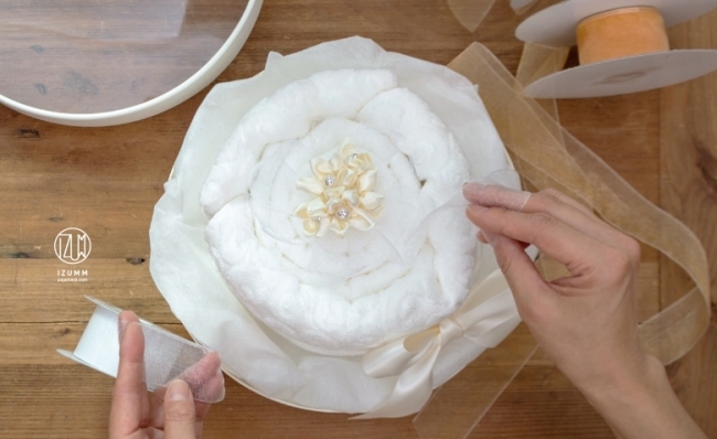 オリジナルデザインの「メレンゲ」タオルを使い、タオルの巻き方、リボンのかけ方、お花の飾り方、などひとつひとつケーキを贈る方の気持ちをこめて、受け取った方の笑顔を思い浮かべながら、手作業でラッピングしています。