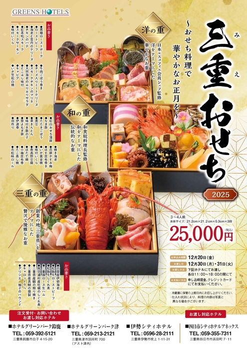 「三重(みえ)おせち2025」は、洋・和・地元三重の食材を使った特別な三段重のおせちです。すべてが手作業で丁寧に調理され、合計42品のお料理が楽しめます。