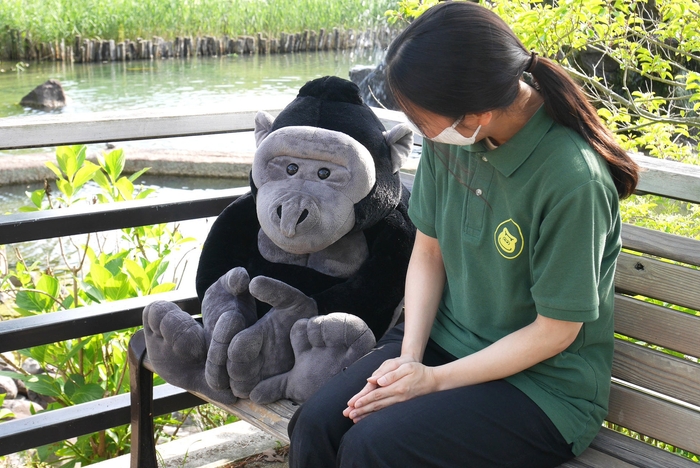 京都市動物園の正面エントランスにあるショップ「ゴリランド」では動物園監修のリアルなニシゴリラぬいぐるみを常時販売しています。このショップ内に展示用として置かれていたのが、販売品の約2倍※1の大きさの特大リアルニシゴリラぬいぐるみです。
