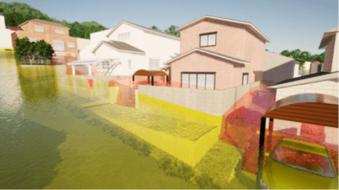 広島県の基礎資料や国土地理院の地図情報などをもとに、ハザードマップを仮想空間で3D化しており、どの程度の高さ、範囲まで土砂が流れ込んでくるのかを可視化しました。ヘッドセットを装着して仮想空間に入れば、被災地内を自由に移動可能。塀の高さを越えて流入した土砂で1階部分がほぼ埋まった住宅や駐車中の車も土砂で覆われるなど、被害を目の当たりにすることになります。