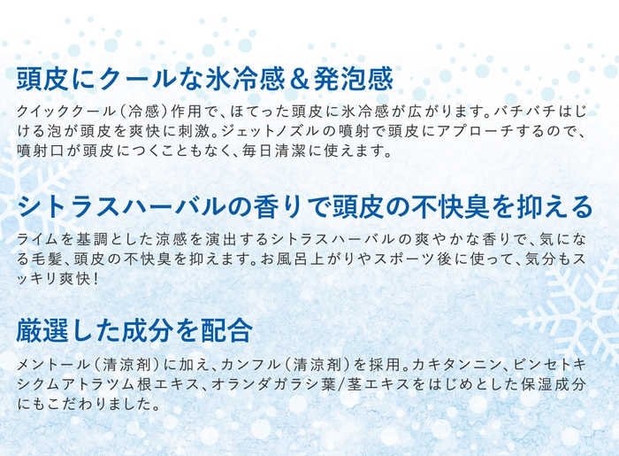 「暑い夏でもさっぱりしたい」というお客様の声から生まれたヘアケアシリーズ。シリーズ共通でメントール(清涼剤)をはじめとする冷感成分を配合。ほてった頭皮を爽快に、心地よい清涼感でクールダウンします。