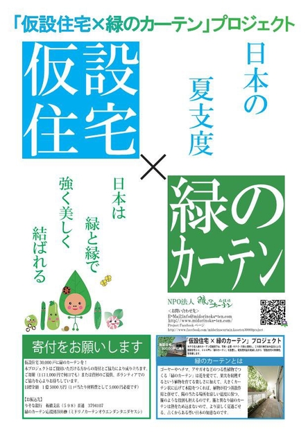 NPO法人緑のカーテン応援団では、このたびの東日本大震災により「仮設住宅×緑のカーテン」プロジェクトを立ち上げ、仮設住宅3万戸に対し無償で緑のカーテンを導入し、電気使用量を軽減しながら仮設住宅の温熱環境を改善する取り組みをはじめました。2011年7月迄に1000戸、2012年7月迄に15000戸、2013年7月迄に30000戸を設置する計画です。