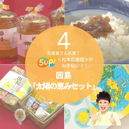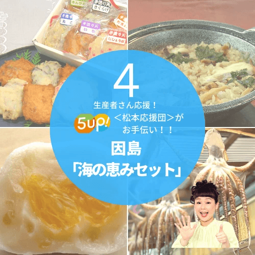 そんな中、因島の事業者から番組へ「因島の現状を知ってほしい」という声が届けられ、5up!<松本応援団>内で フィールドキャスター松本裕見子が商品企画のお手伝いを行う事になりました。普段は島内のホテルで提供されている商品や、100年の歴史を誇る地元の銘菓など 自慢の逸品を特別セットにまとめました。