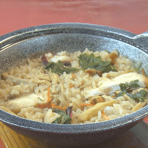村上水軍が出陣前に食したとされるゲン担ぎの食材・瀬戸内のタコや鯛を具材に、特製ダシで炊き上げるホテルいんのしま名物の「水軍釜めし」。
