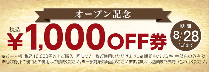 税込10,000円以上お買い上げで、1,000円(税込)を割引いたします! 下記の画像を印刷してお持ちいただくか、画面のスクリーンショットをスタッフにご提示ください。※パリミキ 宇部店のみ有効。