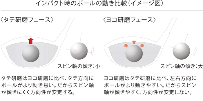 フェース研磨は横研磨が一般的な中、バーティカルポリッシュ(縦研磨)を採用。ボールが垂直方向に動きやすいため、スピン軸が傾きにくく、サイドスピンが軽減し、直進性が向上します。