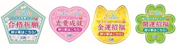 設置する吊り革は、ダルマの装飾を施した合格祈願吊り革(77本)、恋愛成就吊り革(3本)、金運招福吊り革(1本)、開運招福吊り革(4本)で、沿線の8社寺(安倍文殊院、金峯山寺吉野脳天大神、西大寺、信貴山朝護孫子寺、総本山長谷寺、達磨寺、東寺、道明寺天満宮《五十音順》)の協力をいただいています。また、受験生応援グッズとして、車両の転動防止具として日々使用しているハンドスコッチを模した「ハンドスコッチ木札」のストラップを今年新たに発売するなど、例年以上にパワーアップした企画となっています。