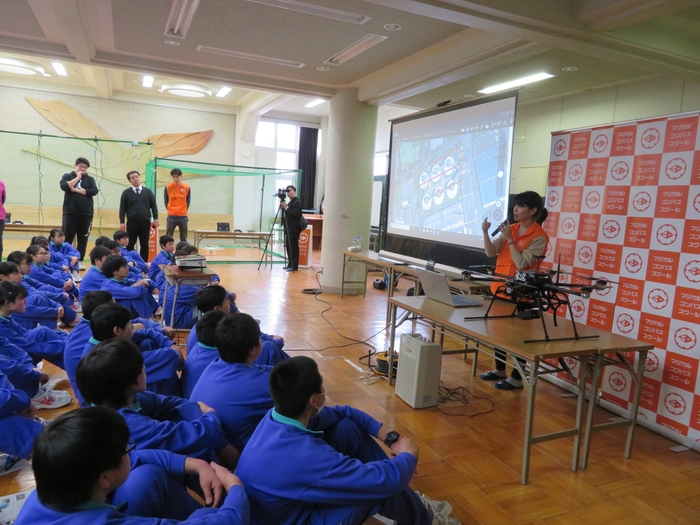 授業では、まず、ドローンを活用した建設現場での作業や、物流に関する実証実験への参加を通じて、地元企業がノウハウを活かして新しい技術に取り組んでいる姿を紹介しました。現場で使っているドローンのデモ飛行を行い、ドローンが滑らかに移動する姿やプロペラの風切り音の大きさなどを体感し、その後、トイドローンを使って、生徒に操作体験もしてもらいました。