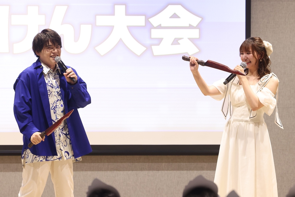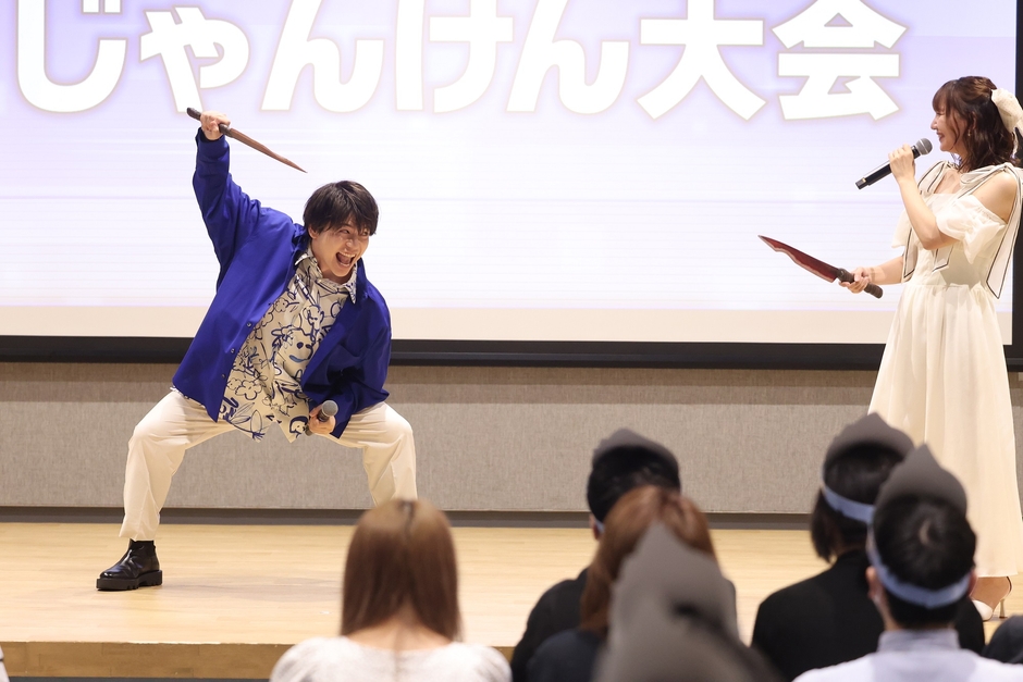 そしてイベントも終盤に差し掛かりユニークシナリオ「じゃんけん大会」のコーナーへ。以前から作品公式Xにてその存在のみ告知されていた「じゃんけん大会」。詳細が明かされないままイベントを迎えたファンたちに司会から、内田さんとのじゃんけんに勝利し続け残った最後の1人には内田さんが演じる主人公・サンラクの装備武器“致命の包丁(レプリカ)”が贈られることが発表され、会場のボルテージは最高潮に。白熱した勝負が続き大盛り上がりで「じゃんけん大会」は幕を閉じました。