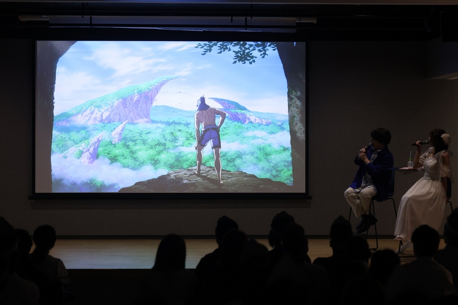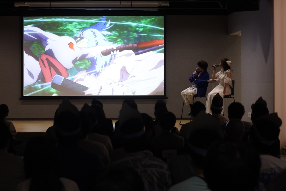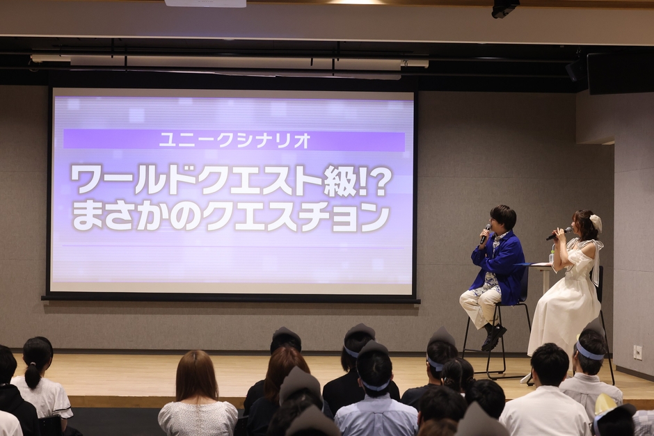 Aパートが終わり休憩がてらエピソードトークに花を咲かせていたところ、突如「ピロリン ピロリン」という音が会場に響き渡り、ユニークシナリオ「ワールドクエスト級!?まさかのクエスチョン!」が始まりました。原作の硬梨菜先生・不二涼介先生、そして窪岡俊之監督の3名からひそかに出演者のお二人への質問を集めてイベント中にサプライズ質問をするこの企画、スタッフから何も聞かされていない内田さん、和氣さんは困惑しながらも3人からの質問に答えていきます。無事にユニークシナリオを攻略した後は、生オーディオコメンタリーを再開。Bパートでは特にアニメ映像の作画の良さについて触れられていて、収録当時の細かなディレクションの話などもあり、会場は大いに盛り上がりました。