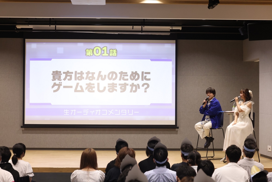 十分に会場が温まったところで始まったのは、アニメ1st season第1話「あなたはなんのためにゲームをしますか?」の生オーディオコメンタリー。会場のファンと一緒に本編を見ながら内田さん・和氣さんが、第1話の内容についての感想やアフレコ時の裏話など当時を振り返ってのエピソードトークを聞かせてくれたほか、自分だったらどのような武器を選択するか・どのようにゲームを進めるかなど自身のゲーム論についてのトークも展開されました。