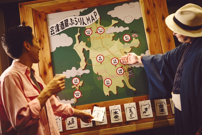 10蔵の酒樽や酒瓶のディスプレイや、杉玉をモチーフとした照明を飾った会場杜氏や酒造スタッフのコメントが入った日本酒紹介パネルを設置。そのコメントを眺めながら日本酒を飲み比べ。さらに酒蔵の概要や特徴をまとめたマップを10蔵それぞれ用意し、気に入った酒造のマップを旅の思い出として持ち帰ることができます。