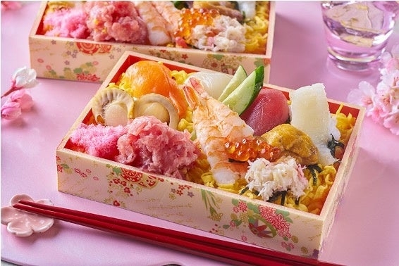 春らしい模様があしらわれた折に、大江戸温泉物語・総料理長監修、こだわりの赤酢を使用したシャリにたっぷりの海鮮を盛り付けて、ライブキッチンでお客様の目の前でお作りする、ホテル鬼怒川御苑の新しい挑戦メニューです。