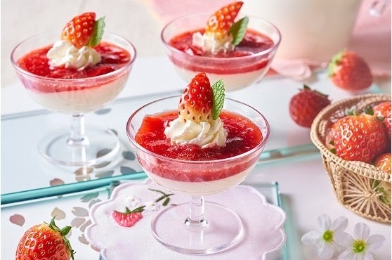 【北海道牛乳と栃木県産いちごムース】 北海道牛乳と地元、栃木県産のいちごを使ったムースの2層仕立てのスイーツ。味の濃い北海道牛乳で作るムースのなめらかさと、爽やかないちごの甘酸っぱさの絶妙なコラボレーションをお楽しみください。
