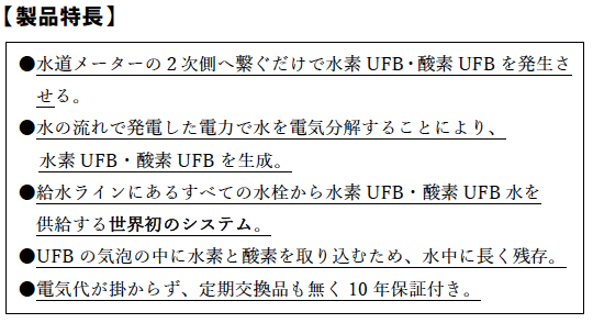 同製品は、水道水の流れを利用して発電し、その電力で水を電気分解することにより水素UFBと酸素UFBを発生させるシステムで、給水ラインにあるすべての水栓からは常に水素と酸素のUFB水が供給され、しかも電気代が掛からない画期的な製品です。