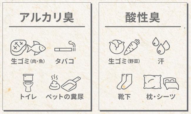 生活の中の臭いは、汗、トイレやペットの糞尿、タバコなどの「アルカリ臭」と、生ゴミなどの「酸性臭」に分けられます。