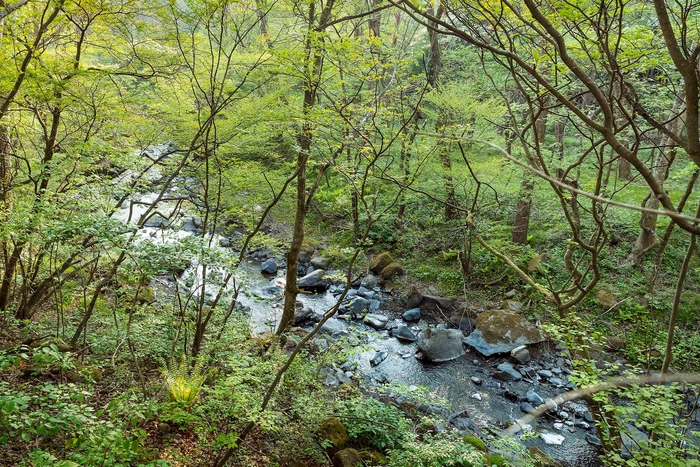 「軽井沢新緑ゆるラン」は、星野温泉 トンボの湯を出発点に、渓流沿いの林道や野鳥の森を、スタッフと一緒に無理のないペースでランニングします。渓流からのさわやかな風を感じたり、時折、野鳥の森から聞こえるオオルリやキビタキの声に足を止めて楽しんだり、頑張らずにランニングできるのが、ゆるランの特徴です。約30〜40分のランニングを終えれば自然と笑みがこぼれ、参加した人たちとの一体感が生まれます。