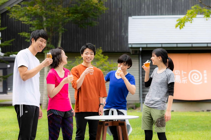ゴール後のお楽しみは、星野温泉 トンボの湯に隣接する「カフェ ハングリースポット」でドリンクを提供します(無料・クラフトビール、もしくはソフトドリンクより選択)。スタッフの掛け声に合わせて、皆で行う乾杯は、完走後のここちよい達成感です。ランニングの汗を星野温泉 トンボの湯で流したい方には、タオル(無料)を貸し出します。