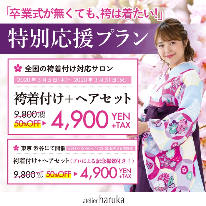 全国62店舗でヘアメイク&ネイルサービスを提供する「アトリエはるか」(株式会社アトリエはるか、所在地:愛知県名古屋市、代表取締役社長:西原 良子)は、各地で卒業式の中止が相次ぎ、袴を着る機会が無くなってしまっている学生さんに何かできないか!と考え、特別企画を実施することになりました!