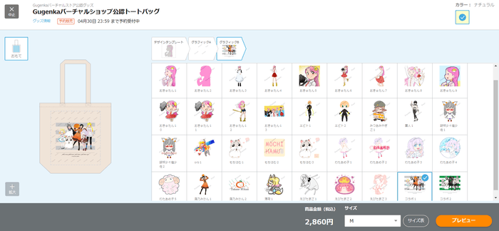 「Gugenkaバーチャルショップ」の公認グッズとして、スタッフの皆さんのアバターグッズを販売!30枚以上のグラフィックの中から好きなものを選んでトートバッグが作れます。スタッフさんたちによるコラボグラフィックもありますよ!