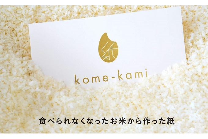 「kome-kami」(コメカミ)は、株式会社ペーパルが2021年2月に開発した、廃棄されるお米を活用してつくった紙素材です。有償廃棄される災害用備蓄食品のお米や、食べられないお米をパルプに配合しています。原料にただお米を混ぜるのではなく、お米の力を引き出し機能性を持たせることで、化学薬品の代替原料として活用し、環境負荷低減とCO2削減を実現しています。さらに、アップサイクルで生まれた価値をフードバンクに還元し、必要とされる方に食品を届ける活動を応援しています。「CO2とフードロスを削減し、困りごとを抱える方をサポート」する新たな循環を広げる。それが「kome-kami」です。