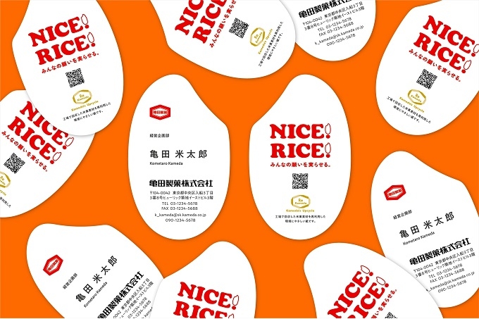 また、「おこめ名刺」の裏面には、Rice Innovation Companyを目指す亀田製菓グループのスローガンである「NICE! RICE!」のロゴを大きく記載。従業員一人ひとりがアンバサダーとして、新しい出会いの場でもお米の魅力や可能性を広めてまいります。