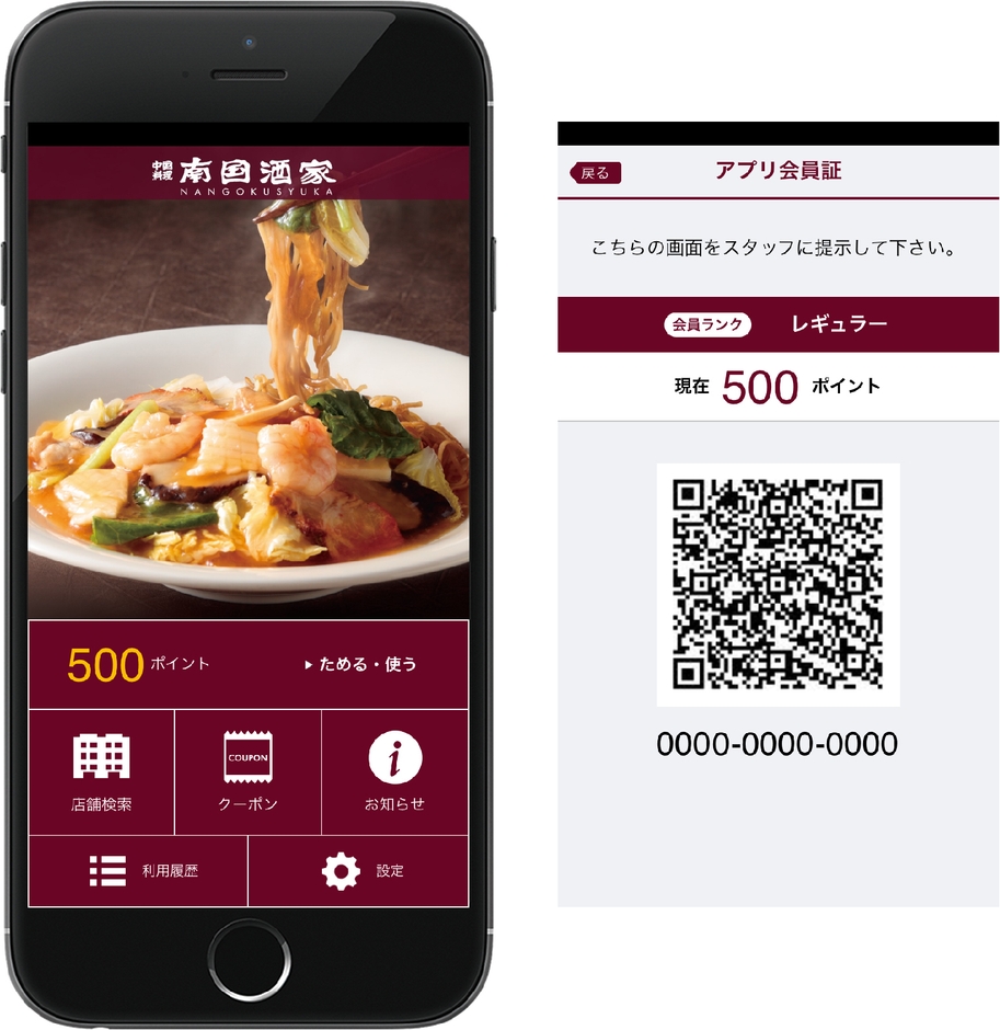 会員証として使える『南国酒家 プレミアムメンバーズ公式アプリ』(以下 公式アプリ)の構築や、アプリのリリースと同時にリニューアルした、会員ポイントサービス『南国酒家 プレミアムメンバーズ』の管理に『betrend 店舗スタッフ向けアプリ』が利用されています。スマートフォンアプリでポイントを貯めることができ、さらに利用実績に応じて会員ランクと会員特典がアップするサービスで、顧客満足度の向上を目指します。