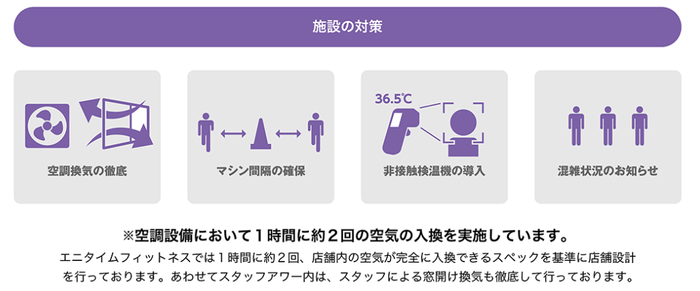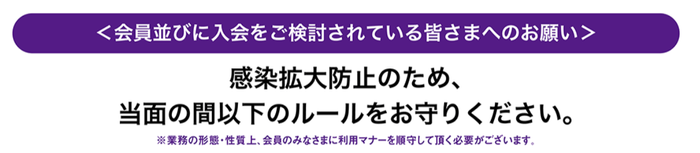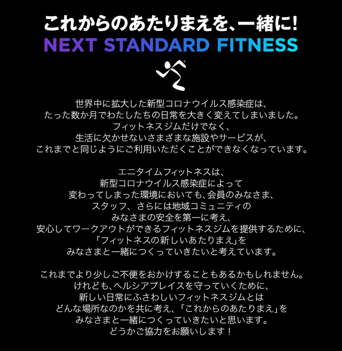営業再開にあたり、運営面および施設面において感染防止のための対策を行うとともに、利用者に向けて、マスクの必着、入館制限、利用時間制限などの新たな利用ルールを発表しました。新しい日常における安全なフィットネスジムの利用には、利用者の協力が欠かせないとして、「NEXT STANDARD FITNESS これからのあたりまえを、一緒に!」というメッセージとともに、安全・安心・清潔・快適なフィットネスジムの継続のために協力をお願いしました。