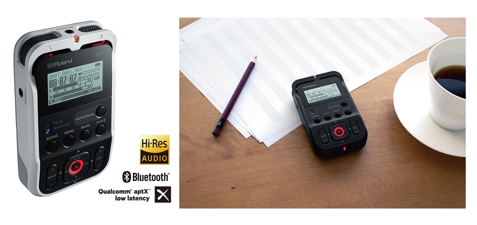 また『R-07』は、楽器や歌など、音楽演奏の場面では特に高い性能を発揮します。音質は、一般的な音楽CDを超える最大24bit/96kHzのハイレゾ・クオリティ。演奏を表情豊かに録音/再生することができます。またBluetooth(R)接続したスマートフォンから、アプリで『R-07』のリモコン操作が可能。同じくBluetooth(R)で接続したワイヤレス・ヘッドホンで再生ができるので、たとえば演奏会のリハーサル時に『R-07』を客席に置き、ステージ上からリモコンで録音を操作、その場で録音した自分の演奏をヘッドホンで確認。音量やバランスを最適に調整してから本番時の演奏を録音することができます。