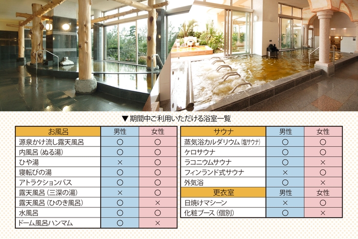 造りの違う男女浴室、普段は男性浴室でしか楽しむことのできないフィンランドサウナや三深の湯・冷や湯を女性のお客様にお楽しみいただくことができ、男性のお客様には、女性浴室にしかないラコニウムや室内外気浴スペースを体験いただける貴重な4日間です。