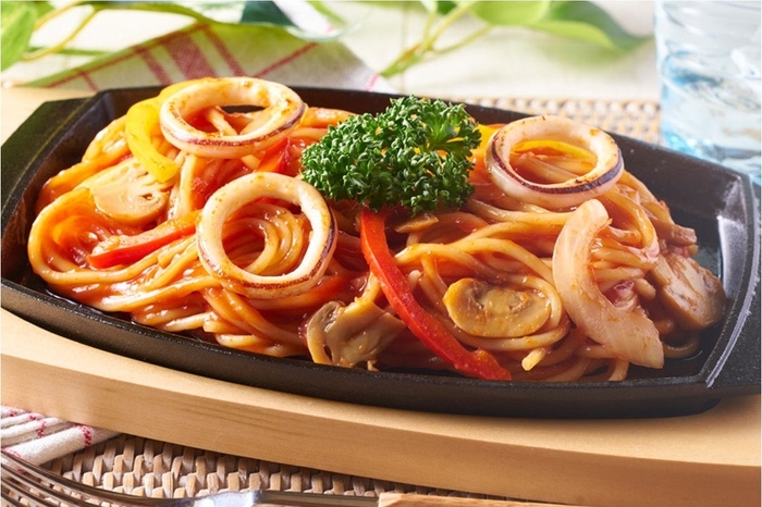 函館を代表する食材であるイカと地場野菜を使い、函館の漁業や農業を応援しよう、という気持ちを込めて2014年頃に登場した函館ご当地グルメ「イカナポリタン」。ホテル鬼怒川御苑では、イカと玉ねぎなどのシンプルな具材を濃厚なナポリタンソースで和えた、B級グルメならではの美味しさをご提供します。