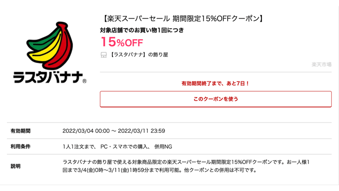 楽天スーパーセール期間中ご利用にラスタバナナの飾り屋で使える15%OFFクーポンです。