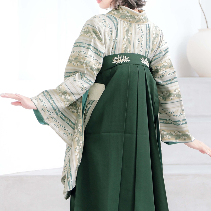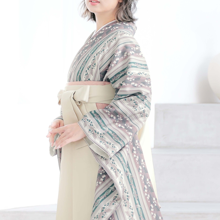 二尺袖着物は小振袖の一種で、袖の長さが二尺(約76cm)であることが名称の由来です。特長としては、振袖に比べて袖が短い、袖が短いので動きやすい、袴と合わせた時のバランスが良いなどがあげられます。二尺袖を袴に合わせるスタイルの「二尺袖袴」は、卒業式を迎える学生の方々に人気です。