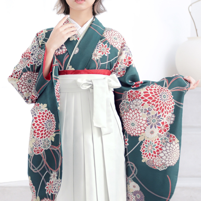 深い青緑色の地に薄茶の輪郭線で大きな花の薬玉文様が表現されています。白、赤、浅い青緑、薄ベージュ、藤鼠色の抽象的な菊や桜の花々、間を流れる組紐。着物ならではの大胆な意匠、強い配色にしていますが、色のトーンを合わせ、現代的な感覚でまとめています。古典の魅力はそのままに、古めかしくならないデザインをお探しの方におすすめです。