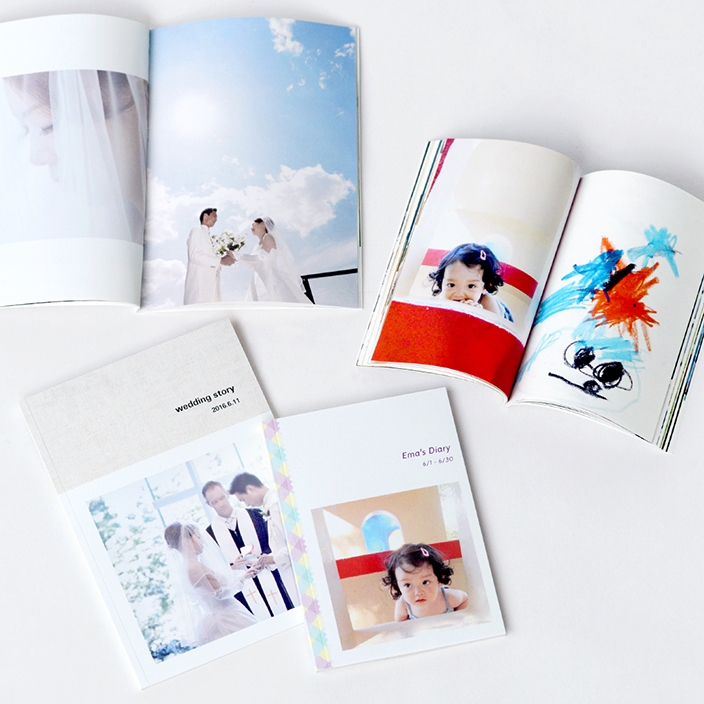 写真が最大62枚入る「A6サイズ・64ページ」は、スマホ内の写真整理や日々の記録などの普段使いに。「B6サイズ・24ページ」は厳選した写真22枚を大きく残せるので、写真が少ない場面やプレゼント用途など、利用スタイルに応じてお選びください。