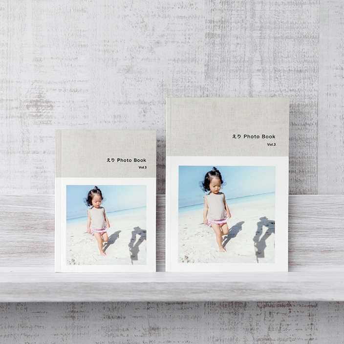 フォトブック本体の厚さは、A6サイズは5.4mm、B6サイズは2.6mmです。厚みのあるA6サイズのみ、背表紙にタイトルが入ります。