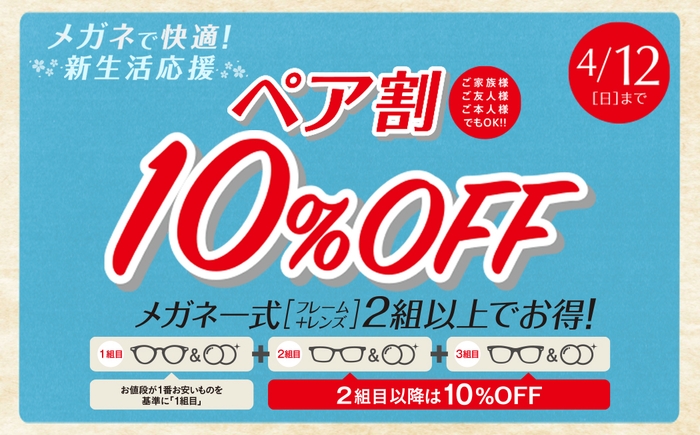 主なセール内容:ペア割10%OFF(メガネ一式+2組目以降が10%OFF)