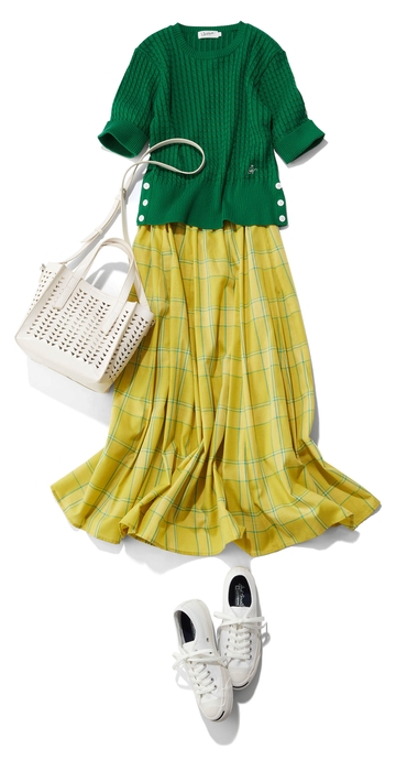 デッサン人気のケーブルマリンニットに軽やかなスカートを合わ せた大人のカジュアルスタイル。今年らしいフレッシュイエローのスカートの足元に、清潔感ある白のスニーカーがおすすめです。
