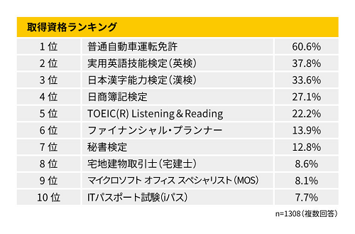 1位「普通自動車運転免許(60.6%)」、2位「実用英語技能検定(37.8%)」、3位「日本漢字能力検定(33.6%)」、4位「日商簿記検定(27.1%)」、5位「TOEIC Listening & Reading Test(22.2%)」、6位「ファイナンシャル・プランナー(13.9%)」、7位「秘書検定(12.8%)」、8位「宅地建物取引士(8.6%)」、9位「マイクロソフト オフィス スペシャリスト(MOS)(8.1%)」、10位「ITパスポート(7.7%)」