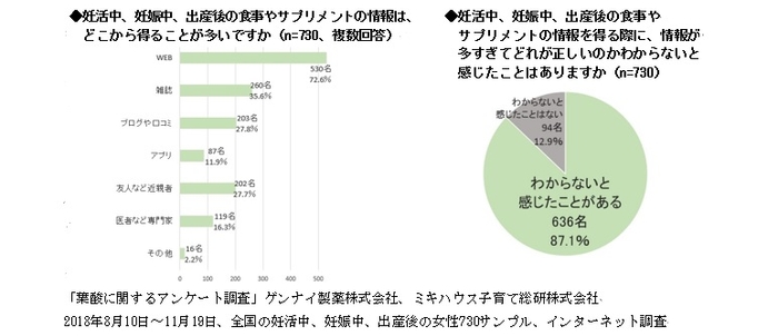 当社は、ミキハウス子育て総研株式会社の協力のもと、妊活中、妊娠中、出産後の女性730名に、アンケート調査を行いました。「妊活中、妊娠中、出産後の食事やサプリメントの情報はどこから得ることが多いですか」と複数回答で聞いたところ、もっとも多かったのは「WEB」で72.6%、そして「雑誌」35.6%、「ブログや口コミ」27.8%、「友人など近親者」27.7%と続き、「医者など専門家」と答えた方はわずか16.3%でした。また、9割近い87.8%にあたる636名の方が、妊活中、妊娠中、出産後の情報が多すぎて、どれが正しいのか「わからないと感じたことがある」と答えています。
