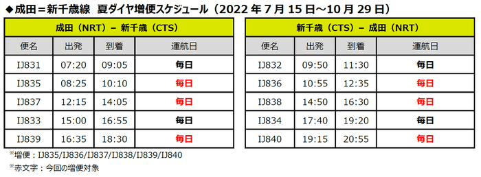 ◆成田=新千歳線 夏ダイヤ増便スケジュール(2022年7月15日~10月29日)