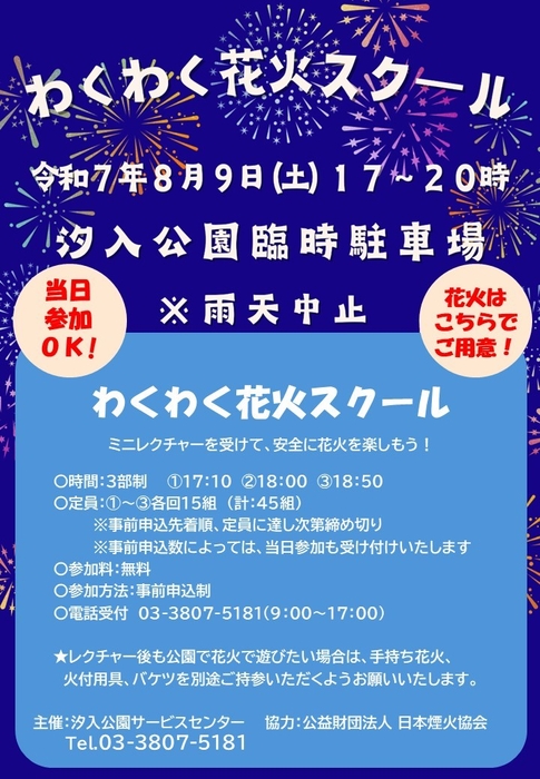 都立汐入公園にて、夏ならではの体験イベント「わくわく花火スクール IN 汐入公園」を開催いたします。