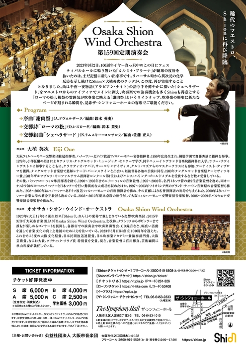 2023年9月2日。100周年イヤー真っ只中のこの日にフェスティバルホールに鳴り響いた「カルミナ・ブラーナ」が聴衆の度肝を抜いたのは、まだ記憶に新しい出来事です。リハーサル時から異次元の化学反応を示し続けたShion×大植英次のタッグが、この度、再び実現することとなりました。曲は千夜一夜物語(アラビアン・ナイト)の語り手を鮮やかに描いた「シェヘラザード」をマエストロからのアイディアでメインに据え、吹奏楽での演奏機会も多くShionも得意とする「ローマの松」、祝祭の雰囲気が吹奏楽に映える「謝肉祭」というラインナップ。吹奏楽の歴史に新たなページが刻まれる瞬間を、是非ザ・シンフォニーホールの客席でご堪能ください。
