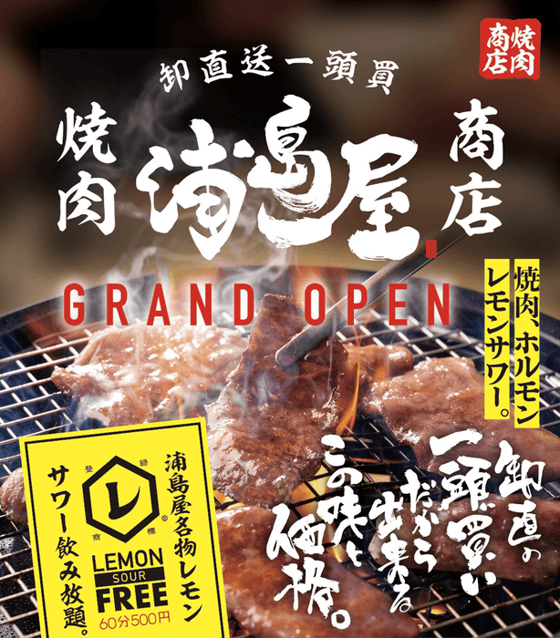 新店舗の「津田沼駅北口店」はJR津田沼駅(総武本線)から徒歩2分、新京成線新津田沼駅からも徒歩6分と交通至便な場所にあり、皆様に気軽にお立ち寄りいただけます。「焼肉商店浦島屋」では今後も順次、新店舗を開設していくとともに、「レモンサワー飲み放題と焼肉がたらふく食べれる焼肉屋」としてお客様に喜んでいただける店舗運営を行って参ります。